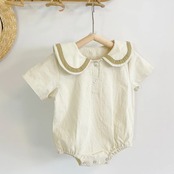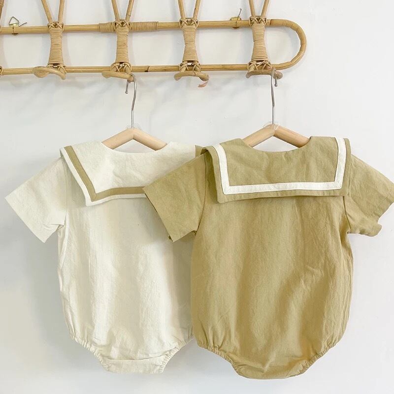 このロンパースは、可愛らしいセーラー襟が特徴の子供服です。くすみカラーが可愛いセーラーロンパースです!また、首元のボタンと股部分のスナップがあるので、着脱が簡単で、お子さまのお着替えもスムーズに行えます。夏のお出かけやイベントにピッタリの一枚です。
