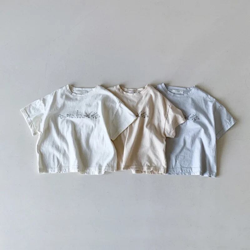 恐竜の柄がポイントの可愛いTシャツです!半袖でコットン生地のため、暑い夏にぴったりです。カラーバリエーションも豊富なので、お子様に似合う一色を選んで頂けたらと思います。